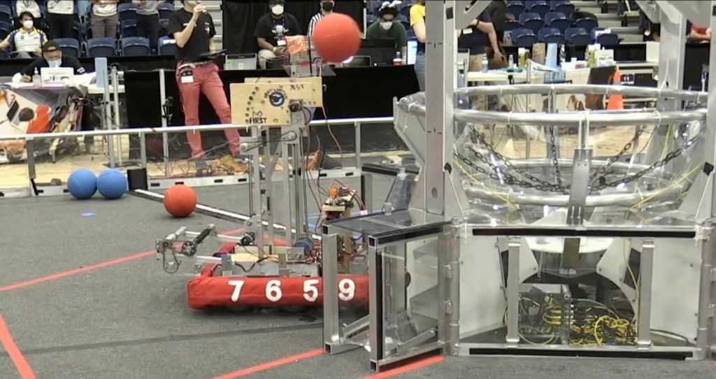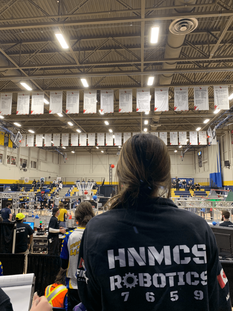 After nearly 29 months since our last in-person competition, FRC Team 7659 HNMCS Robotics has finally returned to the playing field! On Sunday, March 6th, 2022, Team 7659 attended Day 2 of the Humber College District Event, along with 16 other teams from across Ontario. The drive team, consisting of four students ranging from gr 9- gr 12, guided the robot through a total of nine qualification rounds throughout the day. Captain and Captain’s Advisor, alongside several other members, acted as support and worked on scouting in the stands. In this competition, the bot focused on lower hub shooting and lower-rung climbing, in addition to the autonomous drive during the initial period of the round. The team had a mix of first-time competition goers and competition veterans, providing an all-around great experience for the girls. Returning to the workshop, the team is diving straight back into the deep end, in preparation for their next district event on April 10th at St. Mary’s.