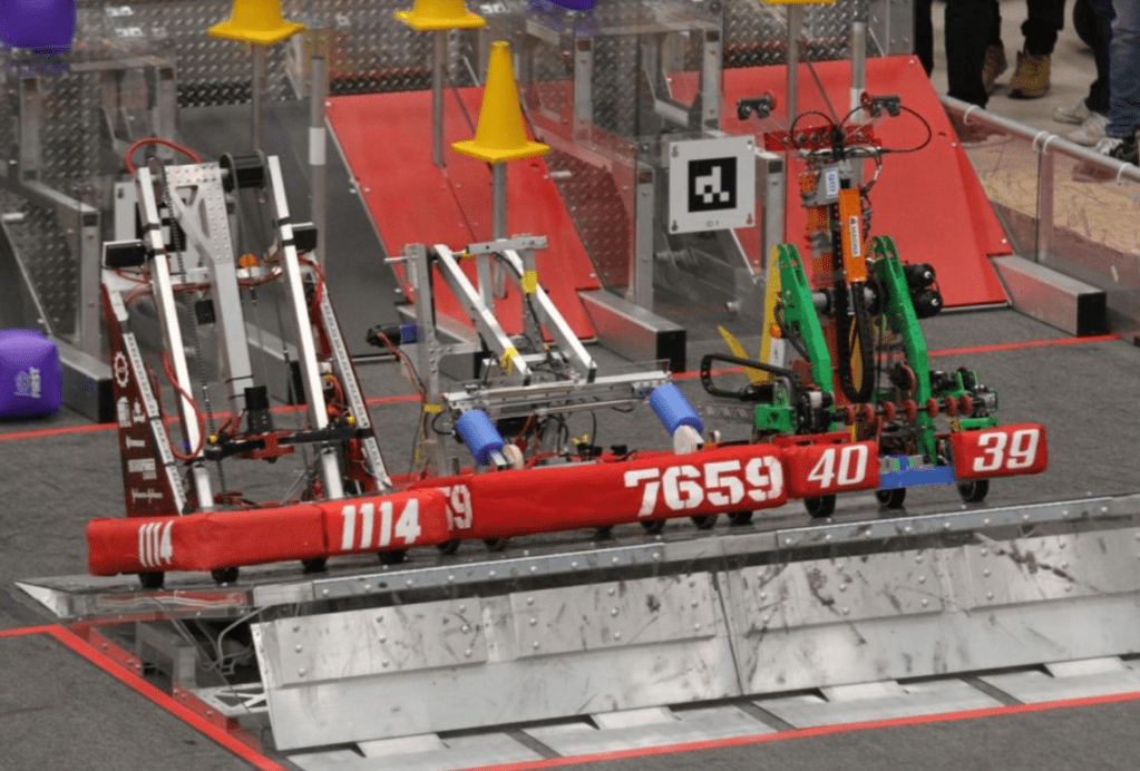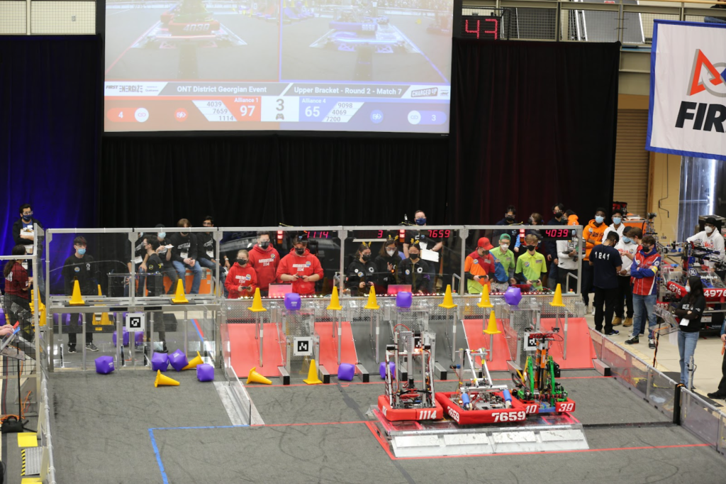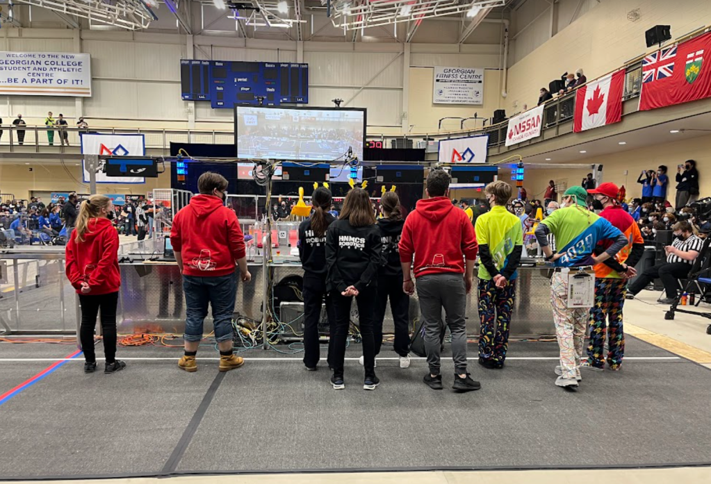 At competition, HNMCS Robotics stood tall during the qualification matches against 28 other robots. Throughout the challenging matches, the robot remained consistent as it successfully completed the autonomous period, scored cubes, and engaged with the charge station every match. The consistency, strength, and stability of the robot was recognized by the highest ranked team, MakeShift Robotics FRC4039 from St. Mary Catholic Secondary School in Hamilton, Ontario, and the third-highest ranked team, Simbotics FRC 1114 from Governor Simcoe Secondary School in St. Catherine’s, Ontario. Together, the trio formed a powerful alliance, leveraging their unique strengths and working in seamless coordination to outmaneuver and outscore their opponents, ultimately defeating all seven opposing alliances in a thrilling display of innovation and teamwork. HNMCS Robotics’ driver, operator, technician and human players fiercely competed against opponent alliances. Additionally, their robot played a key role in the matches as it successfully defended against opponent robots and engaged the charge station every playoff match. In the finals, HNMCS Robotics brought pride to our school as winners of the competition.
